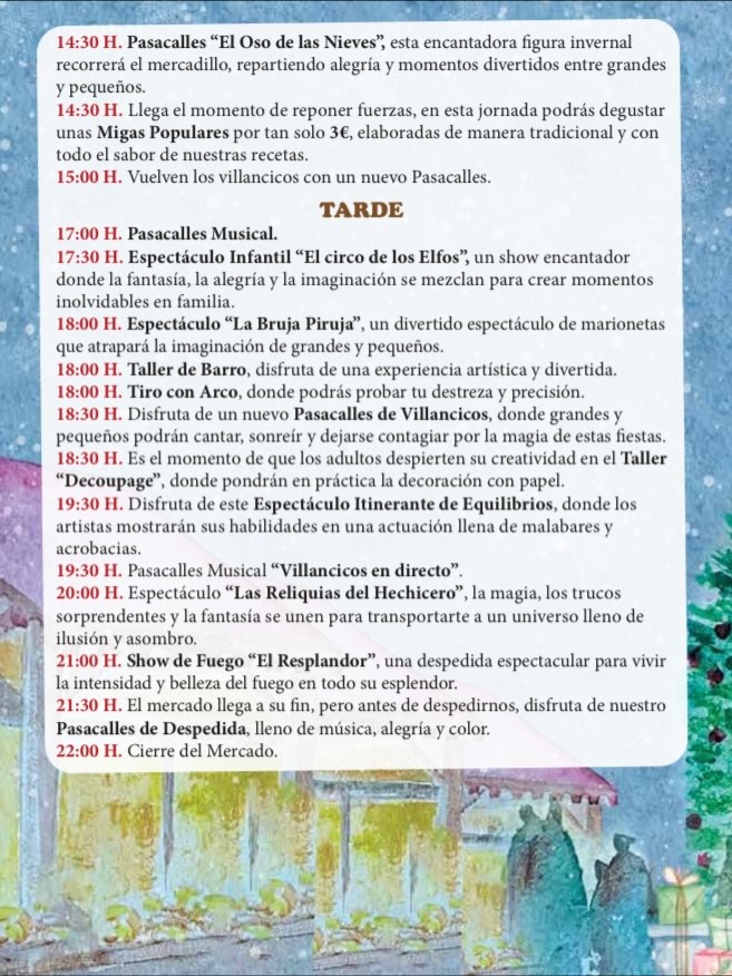 El mercado contará con actividades pensadas para todos los públicos. Habrá talleres infantiles, cuentacuentos, música en directo y pasacalles que animarán continuamente el ambiente. No faltarán las degustaciones de dulces navideños, chocolate caliente y especialidades locales elaboradas por productores y vecinos. También se habilitarán zonas donde disfrutar de comidas típicas de invierno, creando un espacio ideal para reunirse en familia o con amigos.