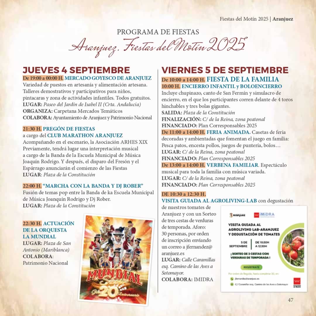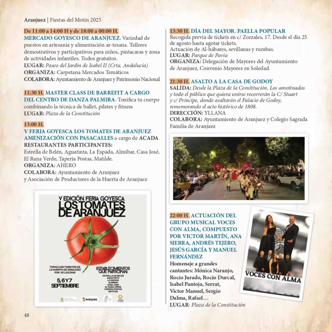 4 al 7 de Septiembre 2025. Consultar la Programación del XV Mercado Goyesco-Fiestas del Motín de Aranjuez.