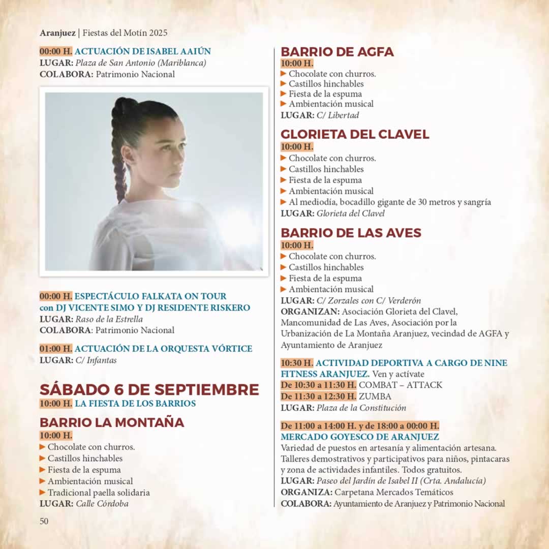00:00 h – Actuación de Isabel Aaiún («la Potra Salvaje») en la Plaza de San Antonio, y sesión de Falkata On Tour con DJ Vicente Simó en el Raso de la Estrella.