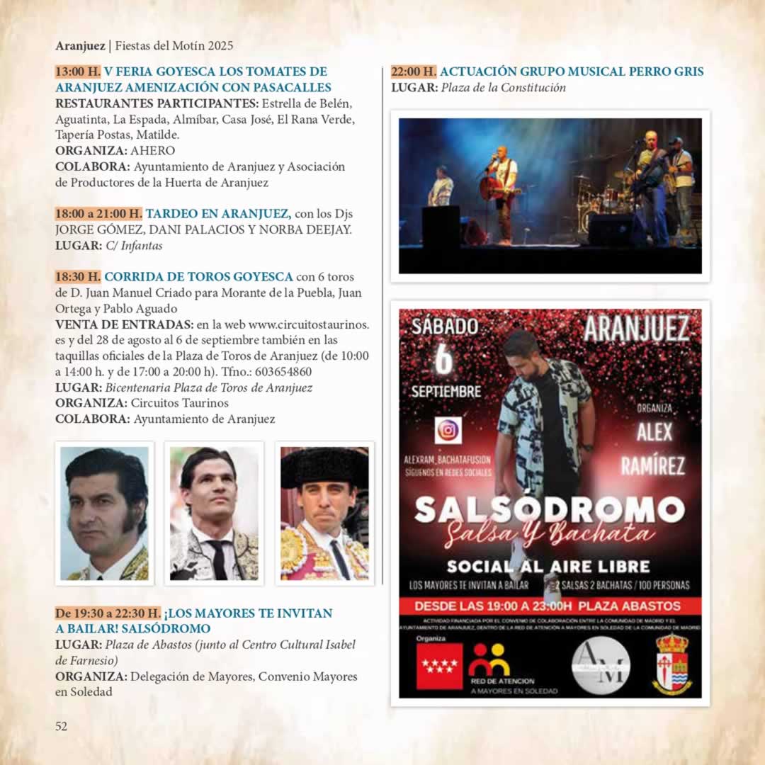 18:30 h – Tradicional Corrida Goyesca en la Plaza de Toros Bicentenaria, con toreros como Morante de la Puebla, Juan Ortega y Pablo Aguado.