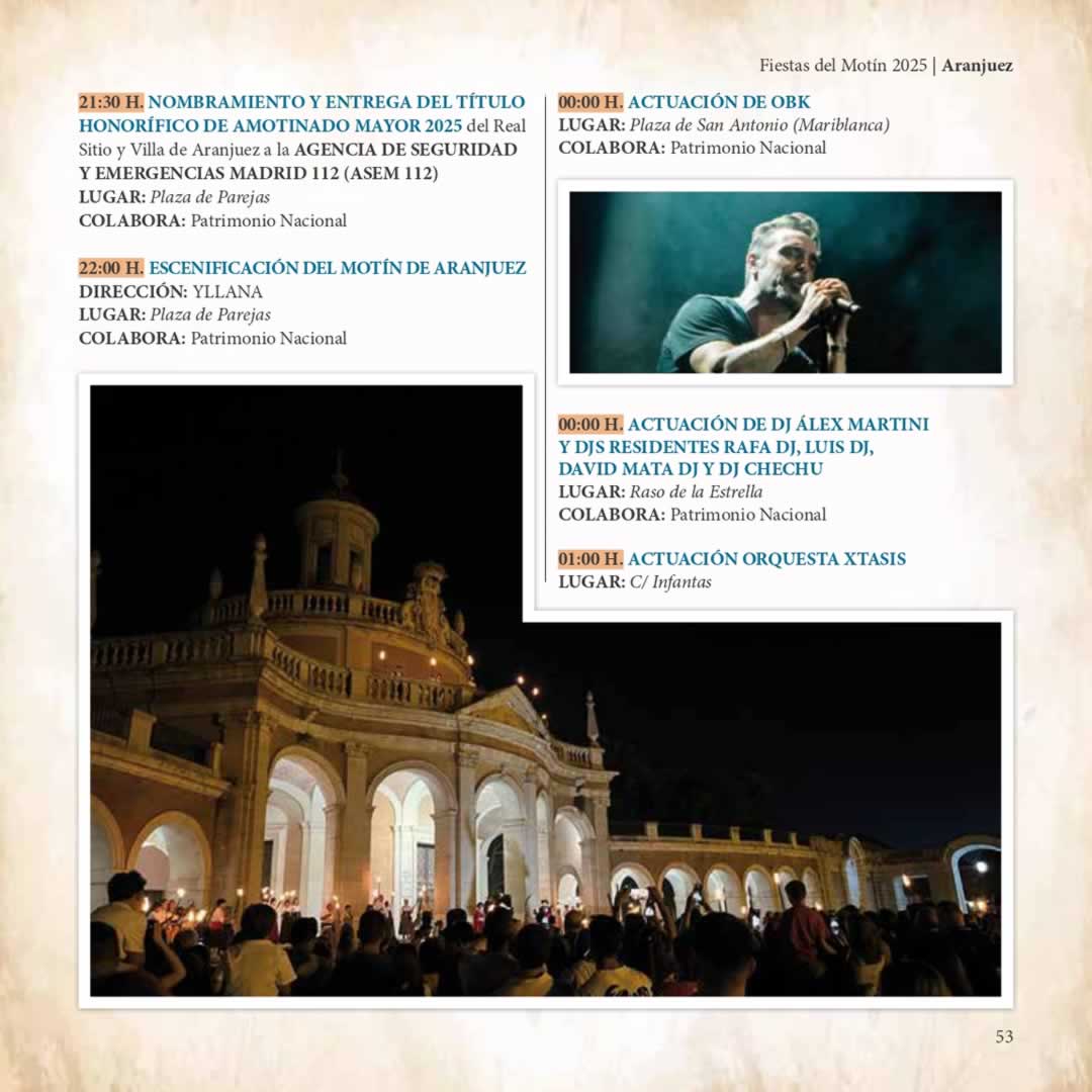 21:30 h – Nombramiento del Amotinado Mayor 2025 (este año, a ASEM 112) en la Plaza de Parejas, seguido de la escenificación del Motín, protagonizada por la compañía Yllana.
