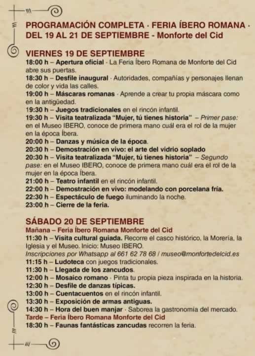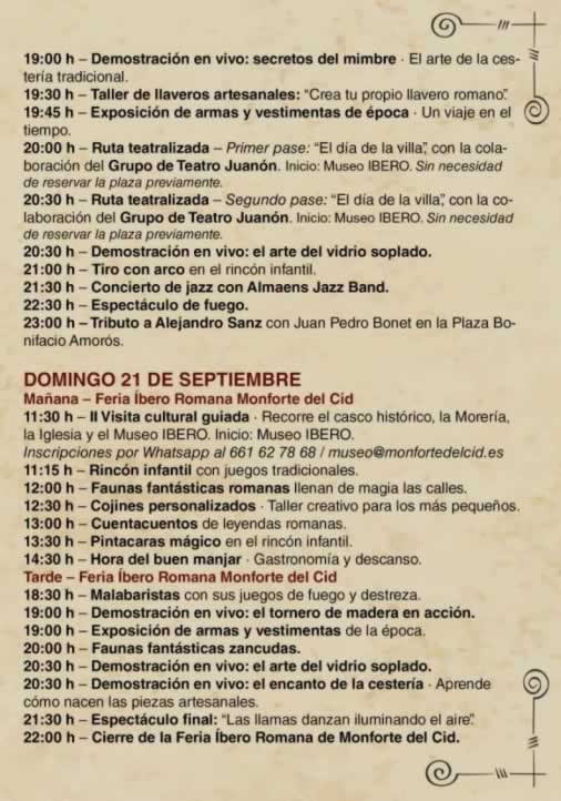 19 al 21 de Septiembre 2025. Consultar la Programación del Mercado Ibero Romano de Monforte del Cid.