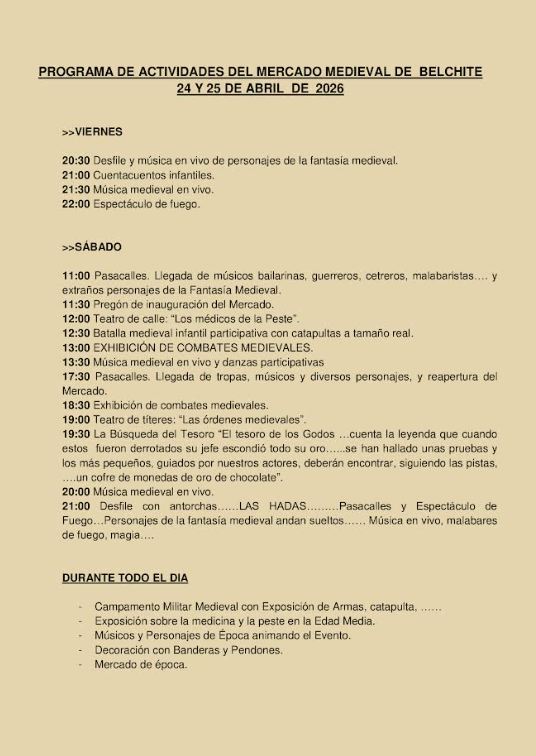 25 de Abril 2026. Consultar la Programación del Mercado Medieval de Belchite.
