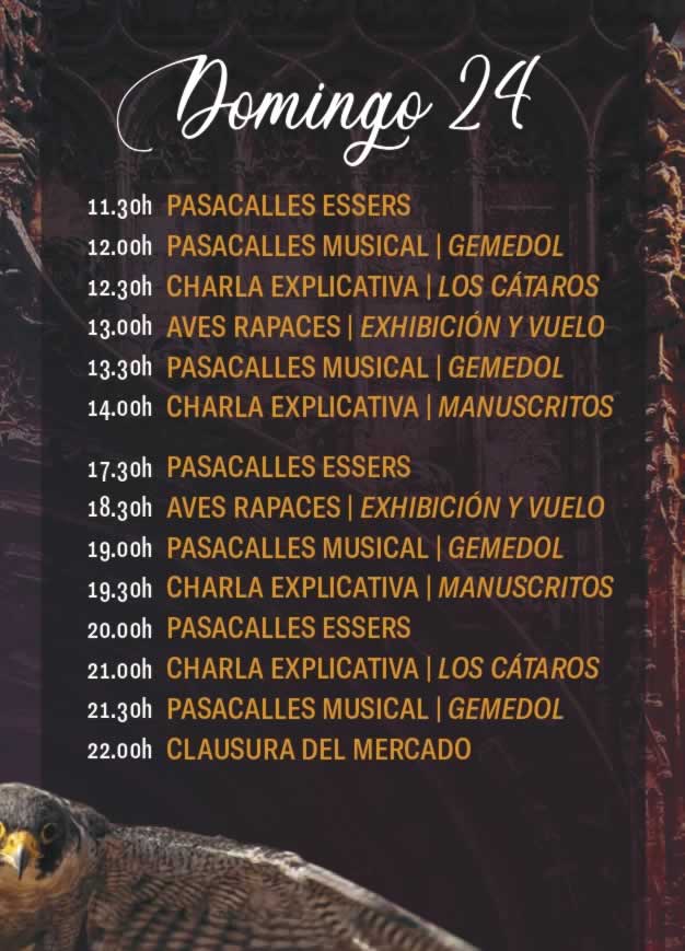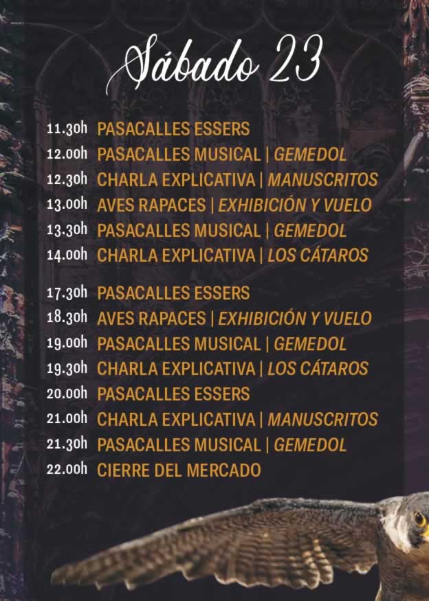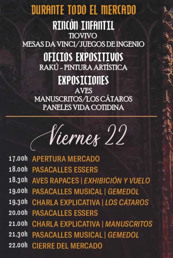 Viernes 22 – Apertura oficial del mercado a las 11:00 h con pasacalles inaugural y música en vivo. Durante la mañana, los visitantes podrán recorrer los puestos de artesanía y gastronomía, además de asistir a talleres de oficios antiguos. Por la tarde, teatro callejero, malabares y exhibición de cetrería animarán las plazas. La jornada concluirá con un espectáculo de fuego y música en la plaza central.