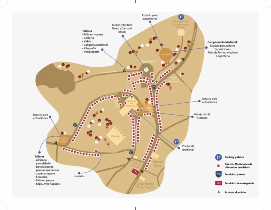 Las calles del centro histórico se decoran con banderines, estandartes y elementos inspirados en la época de los descubrimientos, creando una atmósfera que transporta a vecinos y visitantes a los tiempos en los que partieron las expediciones hacia el Nuevo Mundo. El mercado medieval reúne numerosos puestos de artesanía donde se pueden encontrar productos elaborados de manera tradicional, como cerámica, cuero, bisutería artesanal, textiles y objetos de madera.