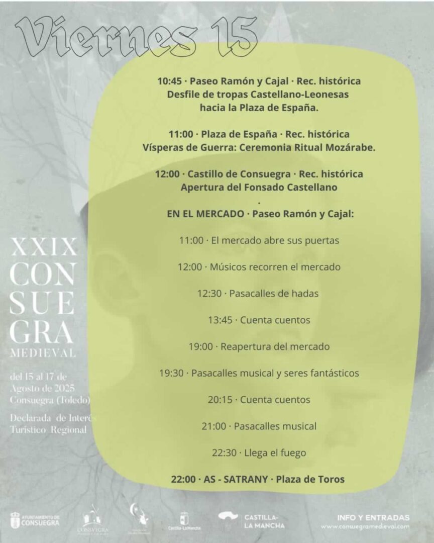 El XXIX Consuegra Medieval 2025 es una de las recreaciones históricas más emblemáticas de España, que tendrá lugar del 15 al 17 de Agosto en la ciudad de Consuegra (Toledo). Este evento transforma la localidad en un auténtico escenario del siglo XI, conmemorando la legendaria muerte de Diego Rodríguez, hijo del Cid Campeador, en la Batalla de Consuegra del año 1097.