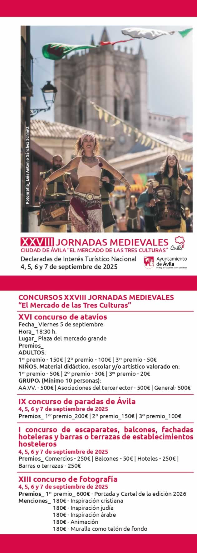 Las XXVIII Jornadas Medievales de Ávila, también conocidas como el Mercado de las Tres Culturas, se celebrarán del jueves 4 al domingo 7 de septiembre de 2025, ampliando su duración y espacios respecto a ediciones anteriores.