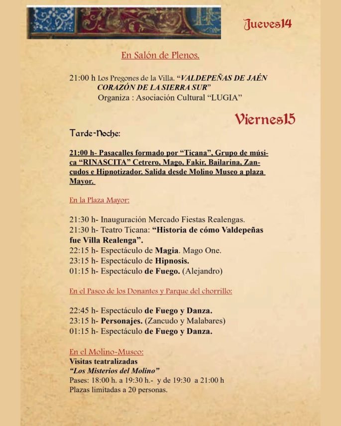 El Viernes 15, a las 21:00 h, un gran pasacalles con músicos, bailarinas, zancudos, magos, cetrería y fakir partirá del Molino Museo hacia la Plaza Mayor, donde a las 21:30 h se inaugurará oficialmente el mercado. Esa noche habrá teatro histórico, magia, hipnosis y varios espectáculos de fuego y danza en diferentes puntos, así como visitas teatralizadas “Los Misterios del Molino”.
