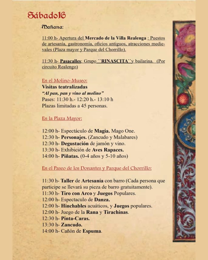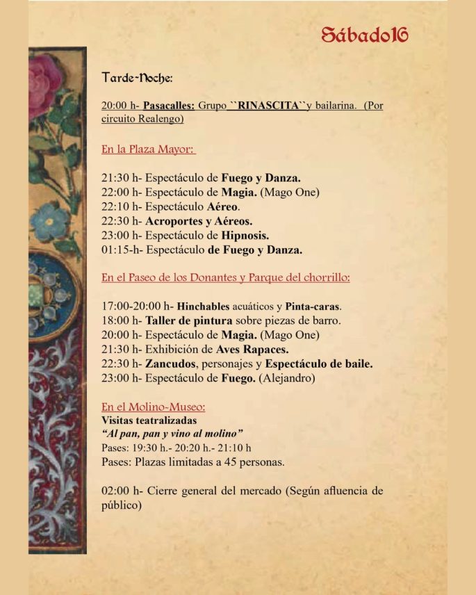 El Sábado 16, la jornada incluirá animaciones en la Plaza Mayor y el Paseo de los Donantes: malabares, acrobacias, magia, aves rapaces y música. El Molino Museo acogerá visitas teatralizadas “Al pan, pan y vino al molino”, mientras que las noches se llenarán de espectáculos de fuego, danza y magia.