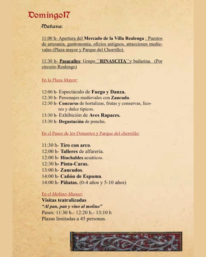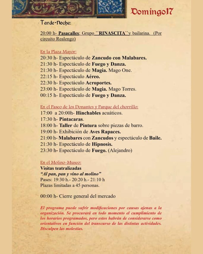 El Domingo 17, último día, se ofrecerán actividades infantiles como hinchables, pintacaras y talleres, exhibiciones de aves, malabares y espectáculos en la Plaza Mayor y el Parque del Chorrillo. El mercado cerrará a medianoche tras un show final de fuego y danza.